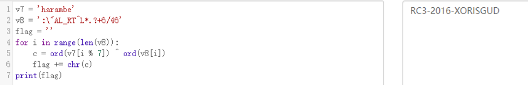 c = ord(v7[i % 7]) ^ ord(v8[i])